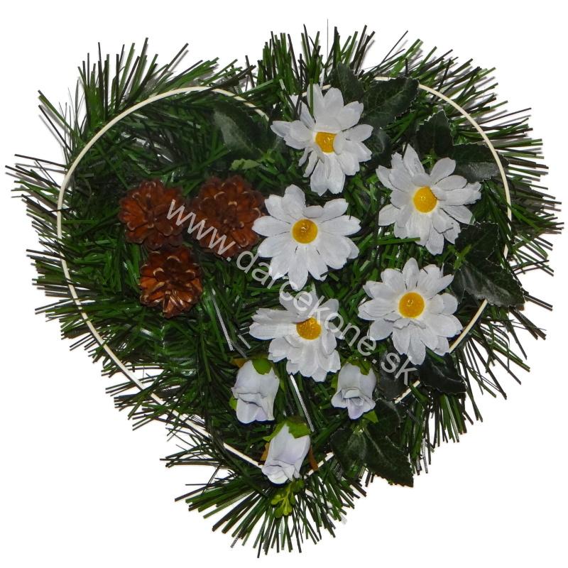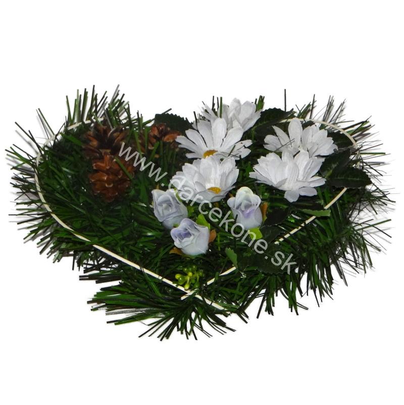 Vkusná dekorácia na hrob v tvare srdca o veľkosti 27 cm, ozdobená jemnými bielymi margarétkami, fialovými ružičkami a prírodnými šiškami. Symbol srdca spolu s bielou farbou vyjadruje čistotu, tichú úctu a večnú spomienku na tých, ktorí nás navždy opustili.